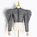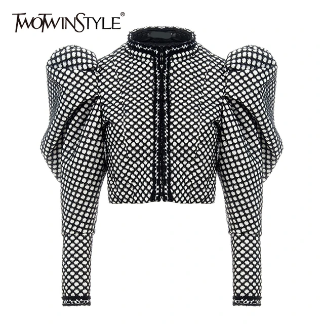 Special Offer TWOTWINSTYLE Ruched Plaid Coat For Women O Neck Puff Sleeve Short Female Coat Streetwear Autumn Fas with Free Shipping Worldwide!
